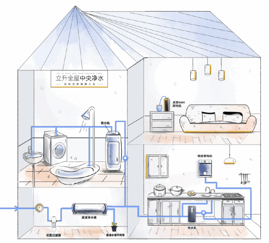 在线下,则构建了26家分公司和超过500家经销商组成的全国销售服务网络。与此同时,还针对不同家庭进行个性化定制服务,提供科学搭配净水设备、一站式安装维护等配套完善的全屋净水定制服务。